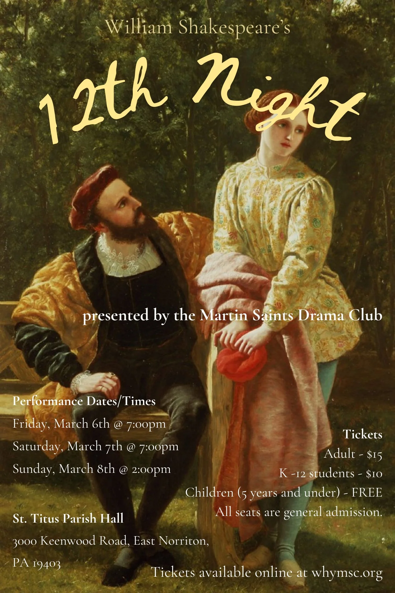 MSC Drama Club Presents: Twelfth Night Friday, March 6, 2026 7:00 PM Sunday, March 8, 2026 2:00 PM Martin Saints Classical High School 3000 Keenwood Road Norristown, PA, 19403 United States (map) Google Calendar ICS Learn more